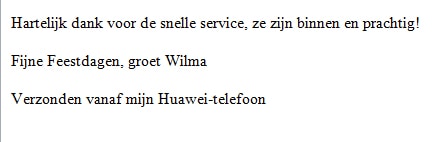 Wilma: “Hartelijk dank voor de snelle service, ze zijn binnen en prachtig!”