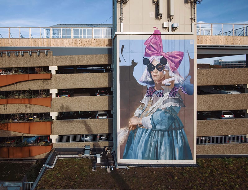 De parkeergarage zelf is ook één van de leukste hotspots in Haarlem geworden, want de buitenkant werd eind november 2018 beschilderd met een heel bijzondere muurschildering van het kunstenaarsduo Telmo en Miel. Bij hen lijkt wel de regel te gelden, groot, groter, grootst, want het is een gigantische beschildering. Kijk eens op hun site wat ze nog meer doen. Op een gegeven moment herken je hun stijl.