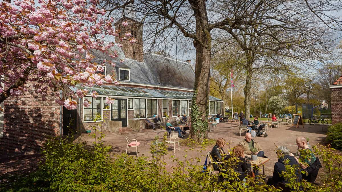 Dit fantastische terras, midden in de Haarlemmer Kweektuin, ligt wat verscholen. Maar als je het eenmaal weet, dan kom je er vaker. Want je uitzicht is groen en iets in de verte staat een enorme volière. Vooral ouders met (kleine) kinderen hebben dit Haarlemse terras gevonden, want overal in de Kweektuin zijn er plekjes waar kinderen kunnen spelen. Er is een kleine speeltuin, voor kleuters, als ook een kabouterwandelpad. En voor de grotere kinderen hebben ze een natuurspeelplek met water en zand en bruggetjes, heel leuk. Dus eerst spelen en daarna iets fris drinken en/of een vegetarische lunch eten op het terras. Als het regent of in de wintermaanden zit je in de grote kas. In de winter kan het daar wel heel koud zijn … Het hele jaar geopend van woensdag t/m maandag van half 10 tot 17 uur.